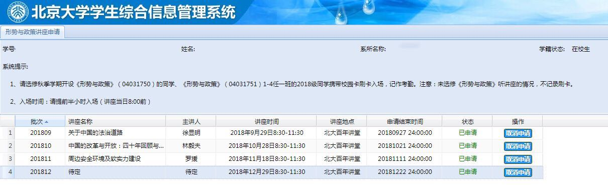 - 面向2018级学生,本学期每场讲座开放600个名额,报名截止时间参见如上2018-2019秋季学期讲座信息表;