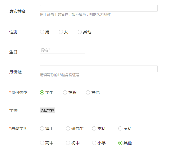5.为了便于对同学们的学习情况进行统计认证,请认真完善个人信息,修改“真实姓名”、填写身份证号,选择米乐mile官方网站、本科等。