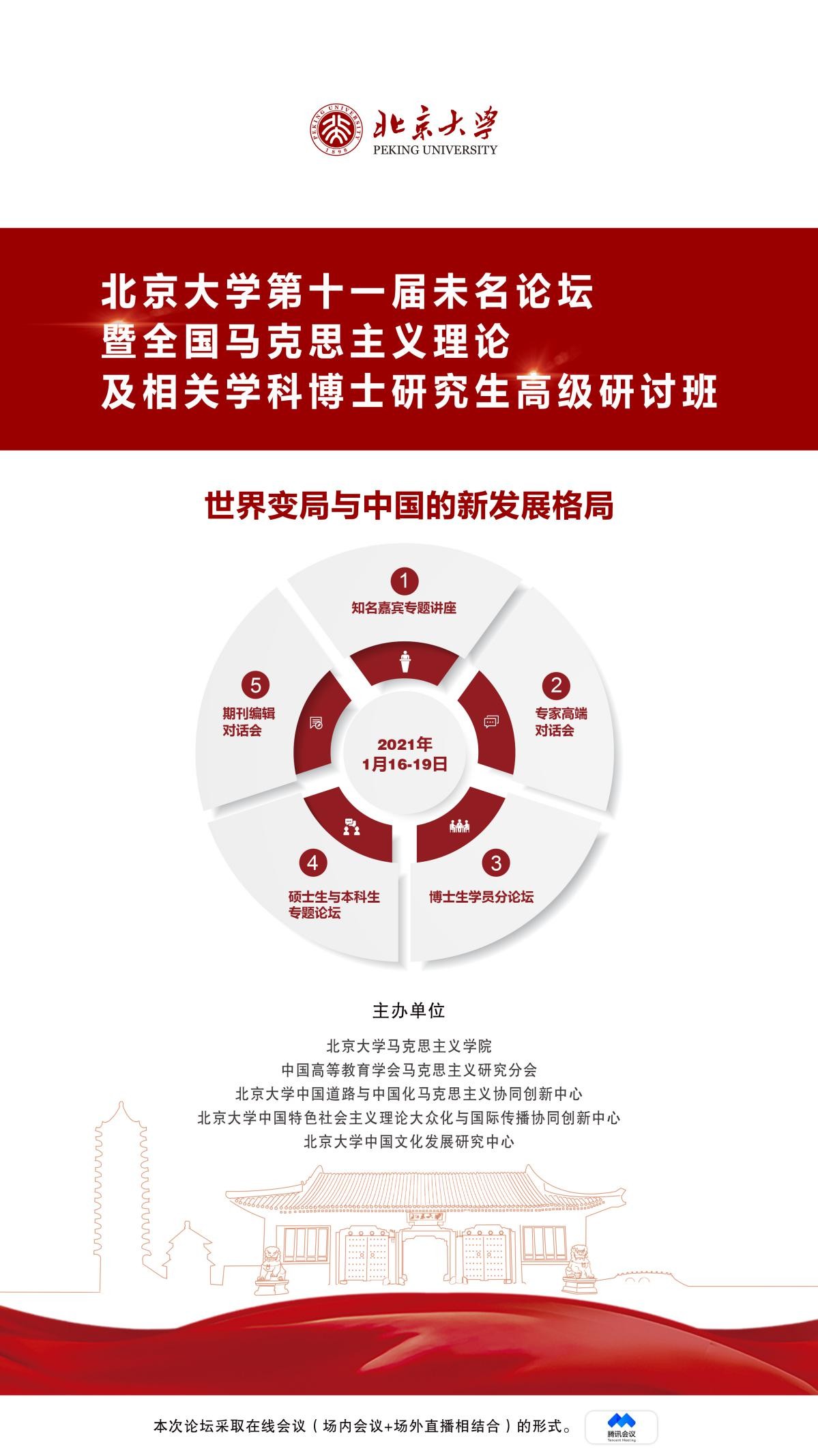 米乐mile官方网站第十一届未名论坛暨全国马克思主义理论及相关学科博士研究生高级研讨班拟于2021年1月16-19日隆重召开,本届论坛主题是“世界变局与中国的新发展格局”。研讨班将邀请国内著名专家授课、讲解,组织多种形式的论坛、沙龙、演讲。论坛以博士生为主,并设有硕士生和本科生的专题论坛。诚邀全国马克思主义理论学科及经济学、政治学、历史学、社会学、哲学等相关学科博士研究生“云”相聚于百廿燕园,共同审视世界百年未有之大变局,共话中国发展新阶段、新格局、新征程,共商、共建、共享具有中国气派的21世纪马克思主义理论。