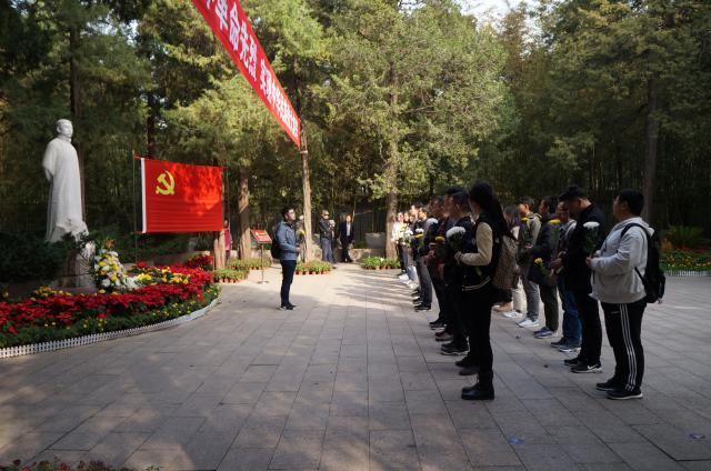 李大钊同志是中国早期传播马克思主义的先驱者、杰出的无产阶级革命家、中国共产党的主要创始人之一,今年也是李大钊同志诞辰130周年,在李大钊同志的公墓前,2018级博士生党支部书记郭俊丽带领全体党员重温入党誓词,随后依次向李大钊同志敬献鲜花,表达崇敬缅怀之情。
