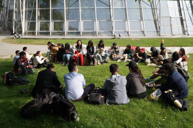 随后,同学们前往植物园召开了“青春告白祖国”主题班会。十月份的北京秋高气爽,同学们坐在草坪上,环绕成“心”型,交流分享参加国庆志愿工作和国庆走方阵的趣事和感想,畅聊《我和我的祖国》的观影体验,气氛活跃、情感真挚。作为参加国庆重大活动的一员,担任志愿者工作的李亚男同学分享了很多活动背后的故事。很多大型活动可能临时发生一些变化,非常考验现场工作人员的耐心、反应能力和自我调整能力。作为国庆群众游行方阵一员的史锡哲同学分享到,他认为亲身参与国庆庆典活动是一件非常有仪式感的事情。这是一场新中国历史课、爱国主义教育课、新时代的政治教育课。