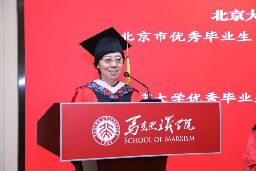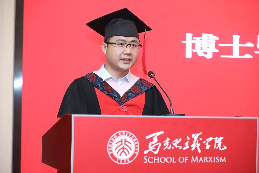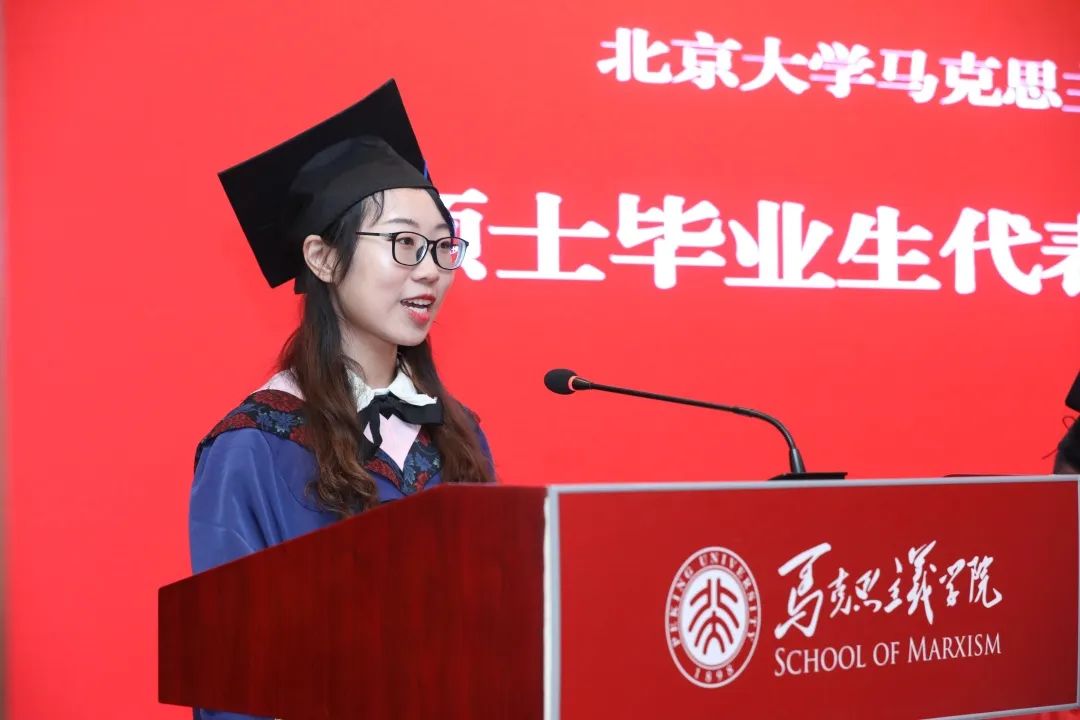 毕业生代表也在毕业典礼上进行了发言,硕士毕业生代表孙可回顾了自己在北大马院充实快乐的学习时光,以及参与编辑马克思主义经典读书报、研究生讲师团等活动的难忘经历。郑重承诺今后将坚守信念,坚持真理;把“爱国、励志、求真、力行”内化于心,外化于行,做无愧于新时代的北大马院人。博士毕业生代表金德楠表达了对北大马院“埋首经典、关注现实”的学术氛围的感动与热爱,深情回忆了读原著、写文章、完成学术任务、担任总助教的难忘经历与收获,祝愿大家都能守得住心中梦想,在服务人民的历程中承担好青年的时代责任、实现好自身的社会价值。