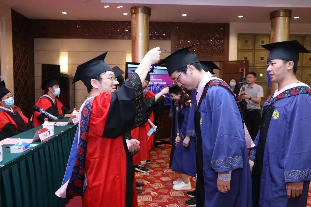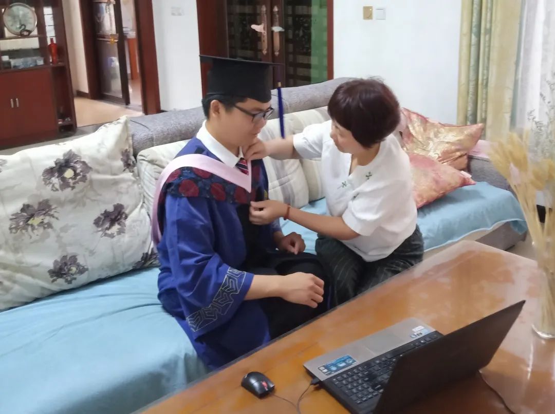 随后,学院领导、导师代表为主会场毕业生拨穗并赠送毕业纪念品。返校毕业生同学按照专业分组,依次接受老师们拨穗。未返校的毕业生通过摄像头,直播了由家人代为拨穗的全过程,大家一同见证了抗击疫情中的特殊难忘仪式。
