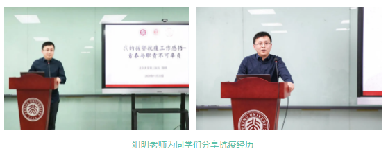 首先,米乐mile官方网站第三医院俎明老师和王慧老师分别分享了自己奔赴武汉,在一线抗击新冠疫情的切身经历。俎明老师是北医三院消化科主治医师,他在抗疫期间担任米乐mile官方网站第三医院援鄂抗疫国家医疗队第3临时党支部书记、第3医生组组长,参与危重病人的救治工作,他以“我的援鄂抗疫工作感悟——青春与责任不可辜负”为题目和学院师生们进行分享,他用朴实的语言分享了援鄂医疗队从最开始面对巨大困难到同时间赛跑、与病魔较量,逐渐掌握疫情斗争主动权,最后打赢抗疫攻坚战的真实经历和他们在抗疫前线经历的感人瞬间。