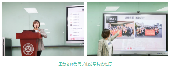 王慧老师是北医三院消化科护师,也是今年第一批驰援武汉医疗队中的一员,在抗疫期间,她任医疗队护理六组组长。王慧老师以“不负天职,大爱无疆”为主题,为学院师生们深情并茂地分享了自己逆向而行,从1月26日到4月6日在武汉抗疫一线奋战72天的亲身经历。她既讲到援鄂初期极端严峻的医疗环境,医护人员不得不用黄色生化服来代替防护服、在0度的天气下衣服被汗水浸得湿了干、干了湿,也讲到医护人员、武汉人民在疫情前众志成城、不畏艰难的行动和精神,医疗队争着抓阄进病房、医护人员连夜记背医疗器械的英文说明书、同济医院为了疫情防控敲碎3000多面玻璃的种种感动瞬间,这些工作的背后是党和祖国人民对武汉的深深牵挂与关切。同时,她还向学院师生们分享了自己在抗疫一线入党,以及同样身为党员的警察父亲带领着她远程共同宣誓的经历,这80字的短短誓词会永远镌刻在她内心深处,成为她终身行动的准则。