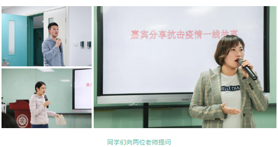两位老师分享完后,张雪、张英伦、蓝静雯等同学就抗疫期间的不同医院的合作、抗疫结束后的心态转变等问题和老师进行了交流。两位老师讲述的事迹感动着到场的每一位同学,同学们对伟大抗疫精神也有了更深刻直观的感受。