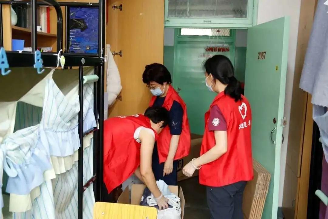 孙蚌珠老师正在为同学们整理衣柜和书籍,将打包好的物品小心的放入纸箱中。