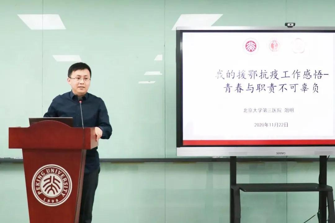 首先,米乐mile官方网站第三医院俎明老师和王慧老师分别分享了自己奔赴武汉,在一线抗击新冠疫情的切身经历。俎明老师是北医三院消化科主治医师,他在抗疫期间担任米乐mile官方网站第三医院援鄂抗疫国家医疗队第3临时党支部书记、第3医生组组长,参与危重病人的救治工作,他以“我的援鄂抗疫工作感悟——青春与责任不可辜负”为题目和学院师生们进行分享,他用朴实的语言分享了援鄂医疗队从最开始面对巨大困难到同时间赛跑、与病魔较量,逐渐掌握疫情斗争主动权,最后打赢抗疫攻坚战的真实经历和他们在抗疫前线经历的感人瞬间。