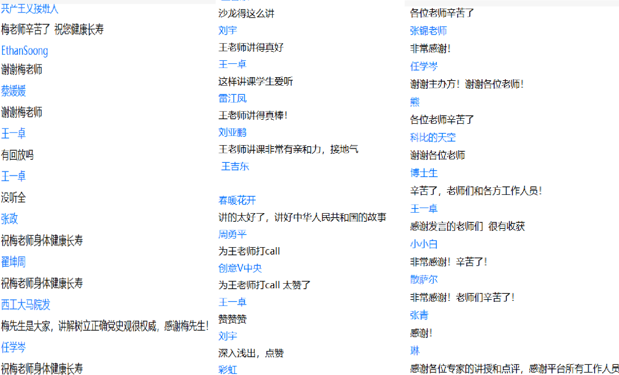 在嘉宾点评的同时,参与沙龙的师生们在腾讯会议聊天室里反响热烈,纷纷表达自己的感受体会和对发言人的赞誉。
