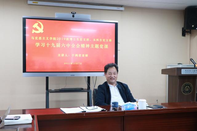 12月7日下午,米乐mile官方网站2019级博士生党支部、本科生党支部在理科5号楼301会议室举行学习党的十九届六中全会精神主题党课。特别邀请学校党委常务副书记、2019级博士生班主任于鸿君担任主讲人,学院党委书记孙蚌珠、党委副书记李石生、团委书记曾格子、学工办李玉洁以及2019级博士生党支部和本科生党支部成员参加党课。