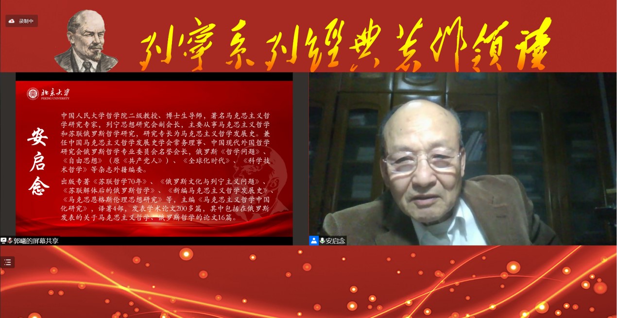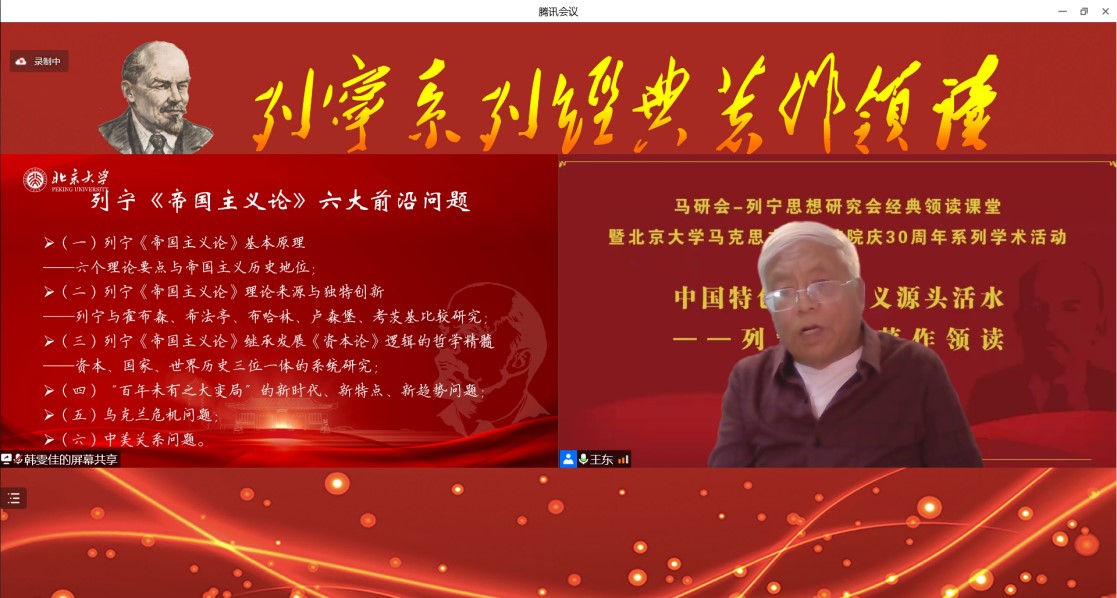 2022年4月19日晚,“中国特色社会主义源头活水——列宁系列著作领读”系列讲座第一讲成功举办,米乐mile官方网站哲学系教授、列宁思想研究会会长王东应邀主讲。本次活动由米乐mile官方网站与中国高等教育学会马克思主义研究分会(以下简称“马研会”)、列宁思想研究会共同主办,米乐mile官方网站经典读书会承办,作为米乐mile官方网站30周年院庆系列学术活动的一部分。《毛泽东邓小平理论研究》编辑部、《社会主义研究》编辑部、《北京行政学院》编辑部协办。会议以线上方式举行,来自全国各地高校的1800余名师生在线上参会。