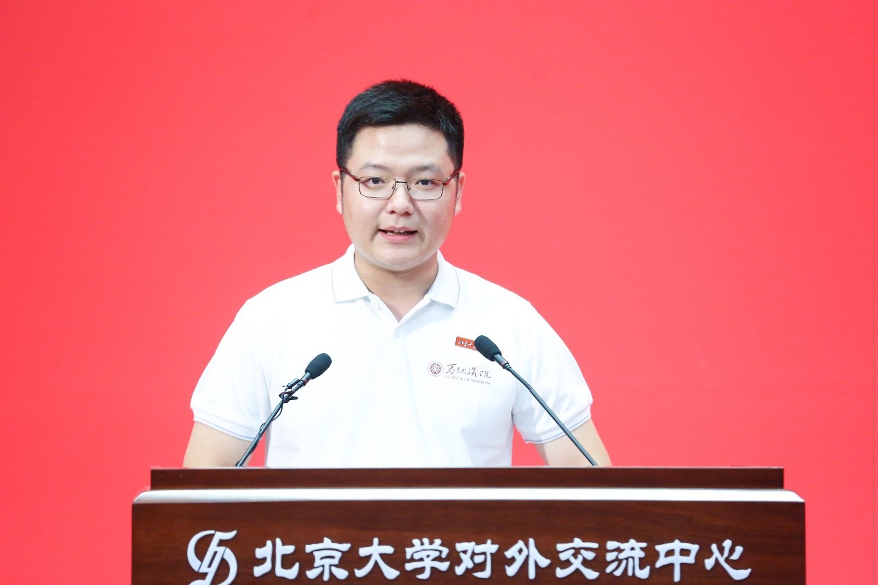 政治经济学专业2022级直博生肖凯元代表全体研究生新生发言。他回顾了自己在本科阶段和在“大钊班”项目中的学习生活,他表示,会时时叩问初心,扎根时代、立足人民,心怀北大培育的先驱精神和探索精神,围绕国计民生的重大关切,不断开辟马克思主义中国化时代化新境界。他分享了自到祖国边陲乡村社会实践的体悟,认为破解时代课题的密码,藏于书本之中,也在广阔的山河田野里。他与同学们共勉,既要有心怀天下的胸襟,舍我其谁的气魄,更应珍惜大有可为的时代,用奋斗和奉献书写青春华章。