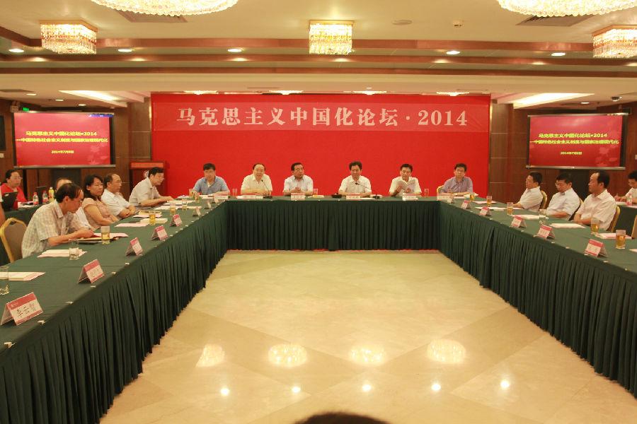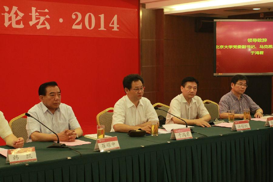 为了深入学习贯彻十八届三中全会精神,进一步推动理论界对全面深化改革总目标的认识,总结完善和发展中国特色社会主义制度,推进国家治理体系和治理能力现代化的宝贵经验,加强首都社会科学工作者的合作和交流,2014年7月8日上午,由中共北京市委宣传部、北京市中国特色社会主义理论体系研究中心、北京市社会科学界联合会、北大、清华、人大、北师大四校米乐mile官方网站联合主办,米乐mile官方网站承办的“马克思主义中国化论坛·2014”在米乐mile官方网站英杰会议中心召开。中共北京市委宣传部副部长崔耀中、北京市社科联党组书记兼常务副主席韩凯、米乐mile官方网站党委副书记兼米乐mile官方网站院长于鸿君教授、北大米乐mile官方网站执行院长孙熙国教授、清华大学米乐mile官方网站副院长肖贵清教授、中国人民大学《教学与研究》主编秦宣教授、国家行政学院许耀桐教授、中共中央党校辛鸣教授等出席会议。论坛开幕式由市社科联党组书记、常务副主席韩凯主持。来自首都高校及理论界的100多位专家、学者、老师和同学参加了研讨会。北大中国特色社会主义理论体系研究中心副主任郭建宁教授,北大米乐mile官方网站副院长孙蚌珠教授、孙代尧教授、程美东教授,院学术委员会主任李翔海教授等参加了会议。论坛得到了人民日报、光明日报、求是杂志等媒体的关注。