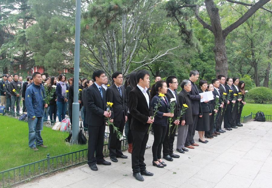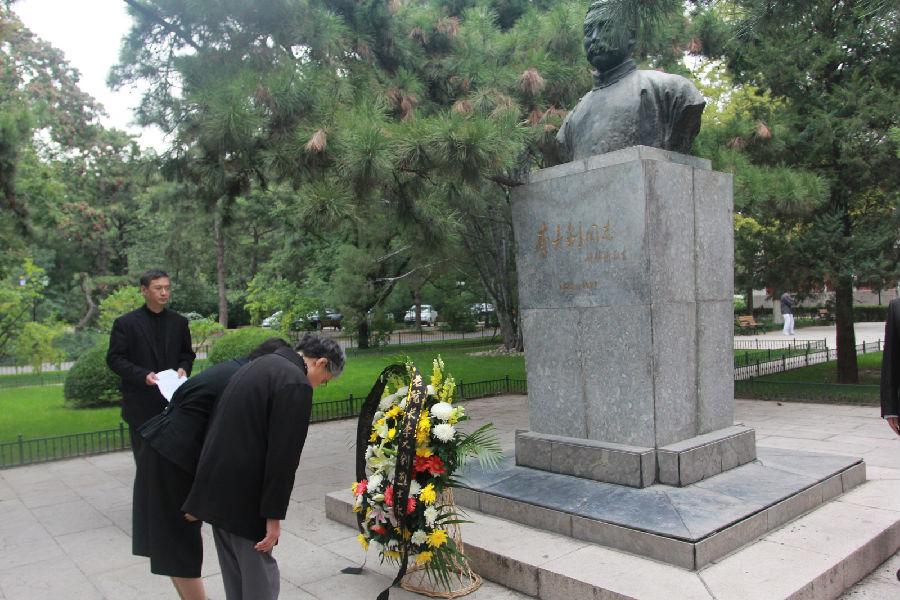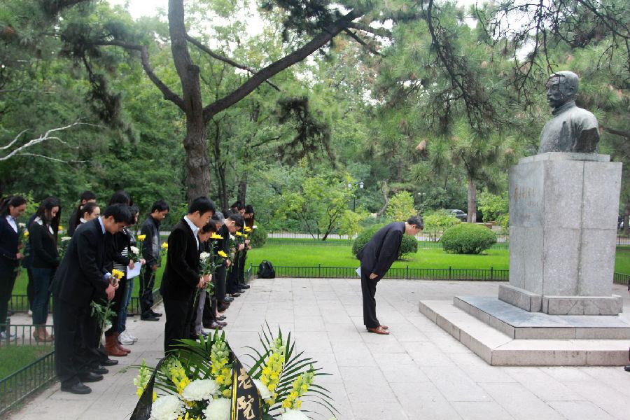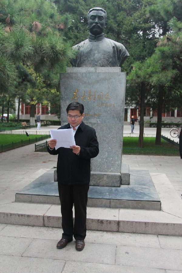 2014年9月30日是全国首个烈士纪念日。在共和国65周年华诞到来之际,米乐mile官方网站师生怀着无比崇敬的心情,在俄文楼李大钊先生塑像前举行庄严的“向李大钊烈士敬献花篮仪式”,深切缅怀革命先烈李大钊先生,并以此向所有为中华民族的独立、自由、解放和进步事业而献身的烈士们表达崇高敬意。米乐mile官方网站执行院长、党委书记孙熙国教授,副院长孙蚌珠教授、老教师代表仝华教授等出席了仪式。学院班主任老师代表、2014级全体硕博新生和各班班长、党团支部书记共60余人参加了活动。仪式由米乐mile官方网站副院长程美东教授主持。