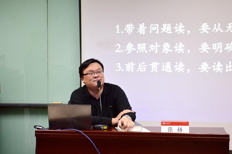 张梧老师对马克思《关于费尔巴哈的提纲》第二条作了富有启发性的解读。他认为费尔巴哈在《基督教的本质》和《未来哲学原理》两部著作中试图明确和论证人的现实力量的客观真理性即思维的客观真理性,而马克思提出的“实践”概念避免了费尔巴哈对黑格尔辩证法的片面倒退,以“实践”这一对象性的感性活动实现了思维与存在的统一,由此《提纲》在本体论和存在论的高度解决了思维和对象的异质性问题。张梧老师还分享了他研读马克思主义经典著作的若干体会,就“如何正确阅读原著”提出了自己的见解。