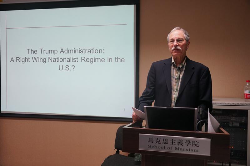 第一场大卫•科兹教授讲座的主题是“特朗普政府:美国右翼民族主义政权?”科兹教授指出关于特朗普的大多数评论都集中于他个人的特点上,例如说话冲动、以自我为中心等。特朗普当选代表了在美国建立右翼民族主义政权的势力,与美国过去比起来是非常大的变化。他认为,如果这个右翼民族主义政权建立起来,对于美国的普通人和世界上大多数人可能都是一场灾难。他还认为,特朗普政权有导致美国资本主义制度结构和意识形态根本转变的可能性。科兹教授还探讨了美国出现右翼民族主义趋势的原因以及未来走向的相关预测。