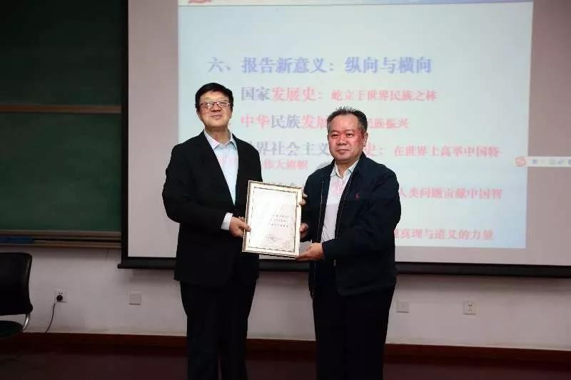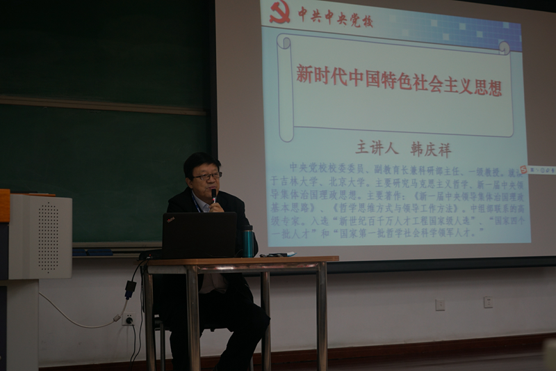 韩庆祥教授紧紧围绕习近平总书记报告提出的“新时代中国特色社会主义思想”重大论断,明确提出“贯穿十九大报告的一条主线,就是站在中国特色社会主义进入新时代且实现强起来的新的历史方位和历史起点上,坚持和发展中国特色社会主义,担负起实现中华民族伟大复兴的历史使命,与时俱进地推进中国特色社会主义理论创新,实现马克思主义中国化新飞跃,开辟中国特色社会主义新时代,把‘四个伟大’提升到一个新的境界”的观点。他从历史新变革、历史新方位、矛盾新内涵、历史新使命、实践新方略、报告新意义六个方面展开,为在场人员带来了一场“思想盛宴”。
