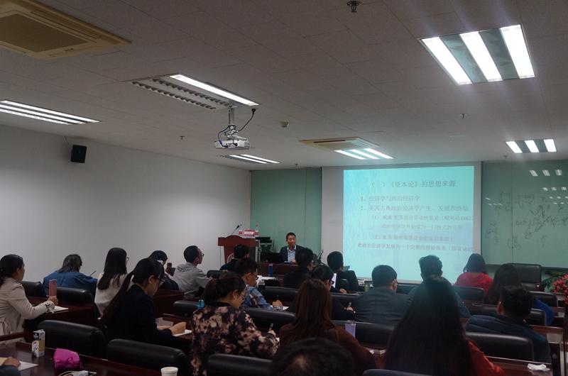 三位主讲教师先后发言,谈了自己的读书心得。王在全教授主讲的题目为“《资本论》导读——虚拟资本与现实”。他强调了研读马克思《资本论》的必要性和意义,肯定了《资本论》这部伟大著作的现代价值。在具体的讲解过程中,王在全老师介绍了《资本论》的思想来源、研究对象、研究方法及理论框架,将《资本论》精炼地概括为“一个基础、三个过程、三条线索、十大原理”,接着分析了虚拟资本与我国现实、金融创新与市场监管等问题。