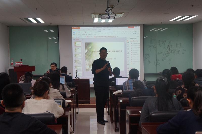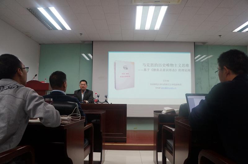 王天民副教授以《德意志意识形态》为文本依据,对马克思的历史唯物主义思维作了深入的阐释。王天民老师先后讲解了“历史唯物主义的属性:马克思创立的新的哲学思维方式或解释原则”、“辩证唯物主义与历史唯物主义的关系”、“历史唯物主义‘同一与差异’的理论视点”、“历史唯物主义的思想主题:传承与超越”、“作为哲学解释原则或思维方式的历史唯物主义的地位和作用”等重要问题。