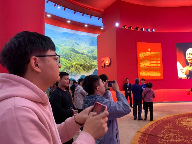 “庆祝中华人民共和国成立70周年大型成就展”展馆布局宏大、内容丰富,以共和国70年接续奋斗的时间轴为主线,以重大历史事件和重要政策方针制定实施为依托,展现了中国人民在中国共产党的领导下取得的一个又一个伟大成就,定格了一个又一个的辉煌时刻。在讲解员的带领下,同学们或驻足观看珍贵历史视频和图片、或仔细查看重要历史文件、或目不暇接于生动的模拟情景展示和实物展示,新中国波澜壮阔的发展历程、感天动地的辉煌成就、弥足珍贵的经验启示,都给予同学们以认识上的充实、心灵上的震撼和信仰上的力量。