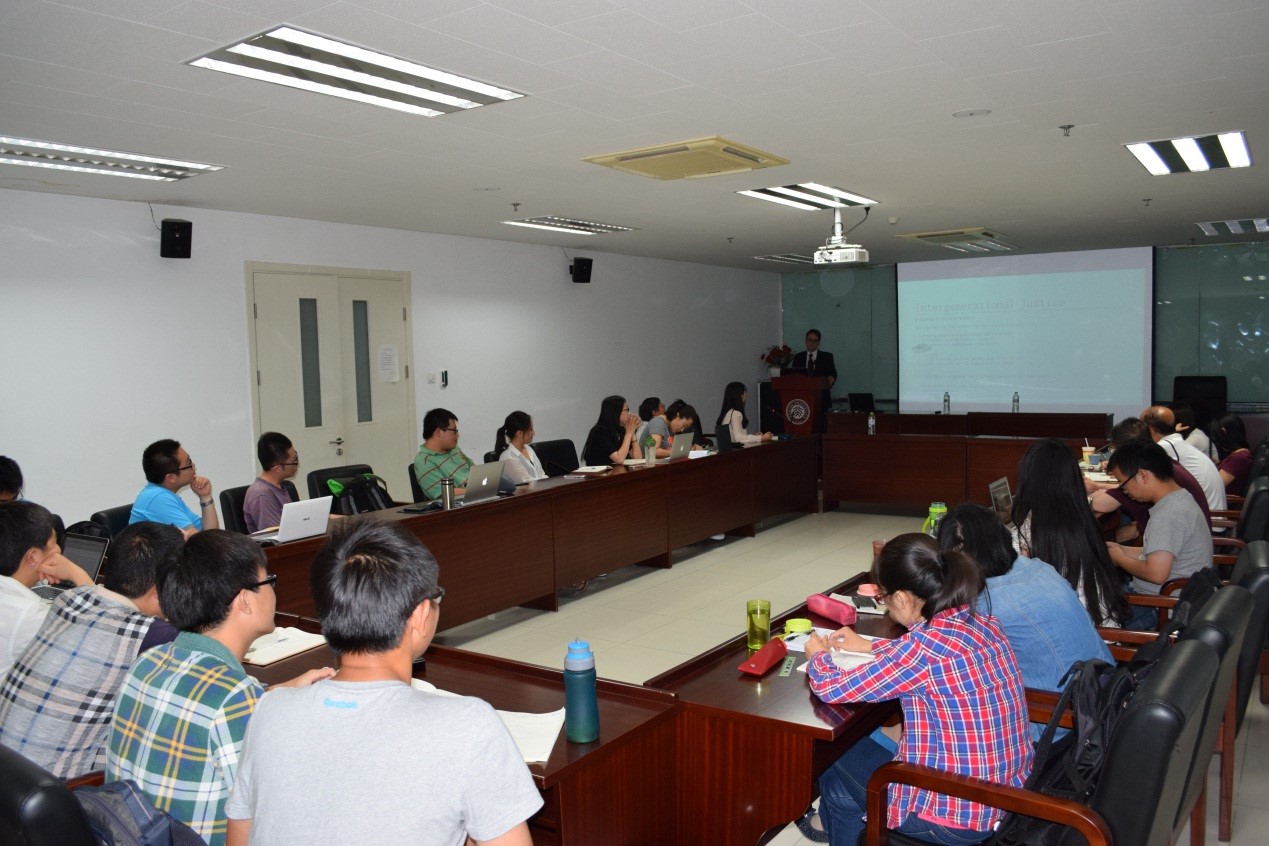 气候变化应对中的“全球正义”、“代际正义”是近年来国际环境哲学、伦理学和环境 政治学界广泛讨论的议题。罗瑟博士毕业于苏黎世大学经济学院,对该议题有着系统与深入的研究,并已发表了大量的相关性著述。在演讲中,他首先阐发了基于实 证研究的四种关于代际正义的理念——给予后代更高的、和我们持平的、维持后代基本需求的和很低的福利,然后从欧盟或欧洲国家的视角阐述了气候变化治理中的 全球正义及其政策意涵。在互动环节,现场教师和同学分别从当代人之间的代内公平、未来世代为气候变化付出代价的不确定性等方面进行了提问和发言。